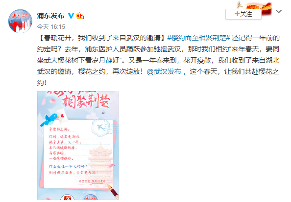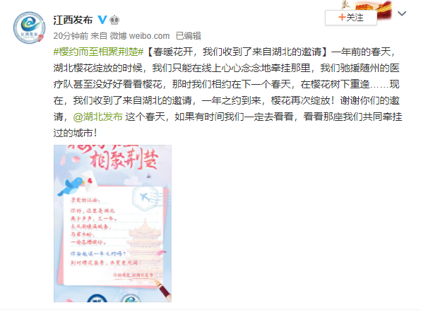 发布会结束后,湖北发布第一时间通过微博邀约海报,请全国人民共赴这场“樱花之约”。