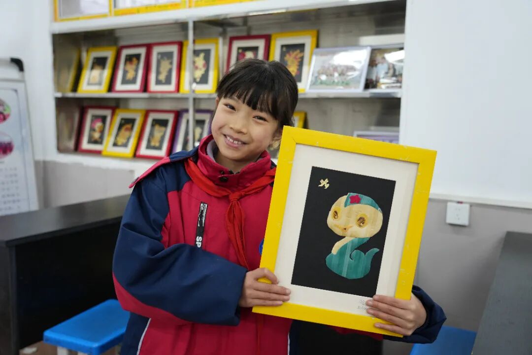 当看到一位小朋友制作的蛇形麦秆画已初具雏形时,潜江市浩口镇三小学生付琢越自豪地说:“我学麦秆画已经半年了!这次创作这幅蛇元素的作品,是因为蛇年快要到了,我想祝大家蛇年快乐,巳巳如意!”稚嫩的话语满含对传统技艺的热爱与对新年的美好期许,也彰显出非遗传承在校园已生根发芽。