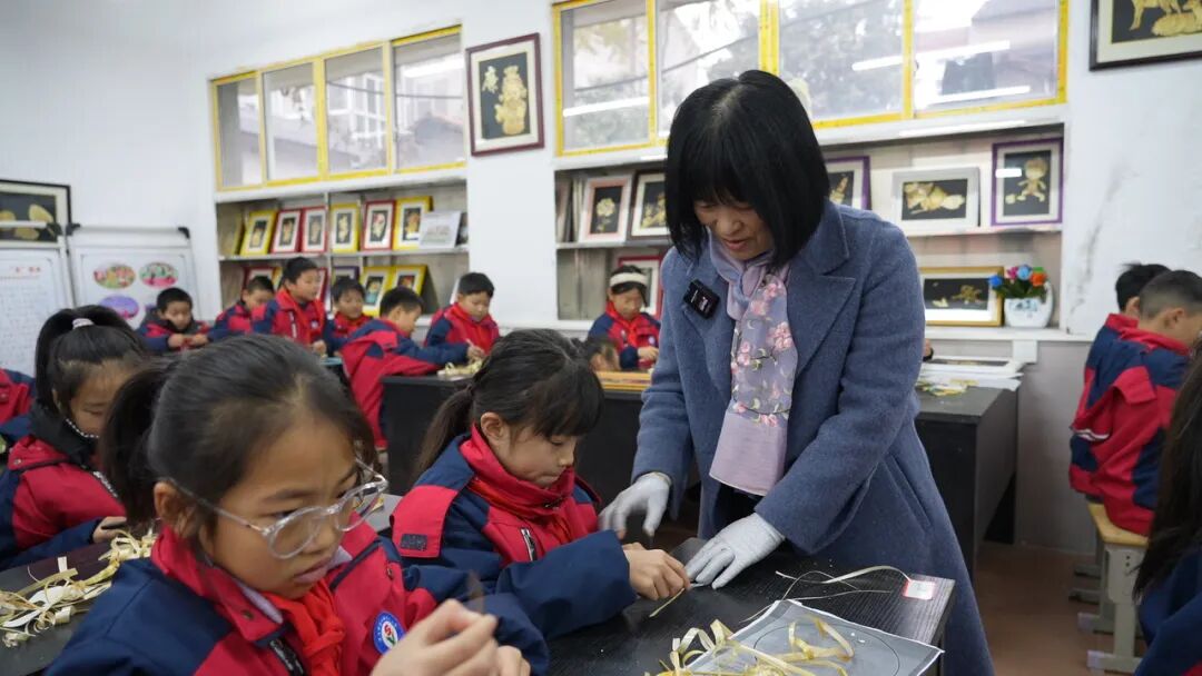 如今,在潜江市浩口镇三小的手工课堂上,已成为麦秆画省级代表性传承人的李洋芳,正以其专业与热情引领孩子们踏入这一传统艺术殿堂。“同学们上课了啊!今天我们学习的内容,就是做麦秆画《金蛇送福》。”随着李洋芳亲切的开场,麦秆画独特的艺术魅力瞬间抓住了孩子们的目光。课堂上,李洋芳详细讲述麦秆画的历史渊源与精巧制作工艺,孩子们听得如痴如醉,沉浸在这古老技艺的知识海洋中。