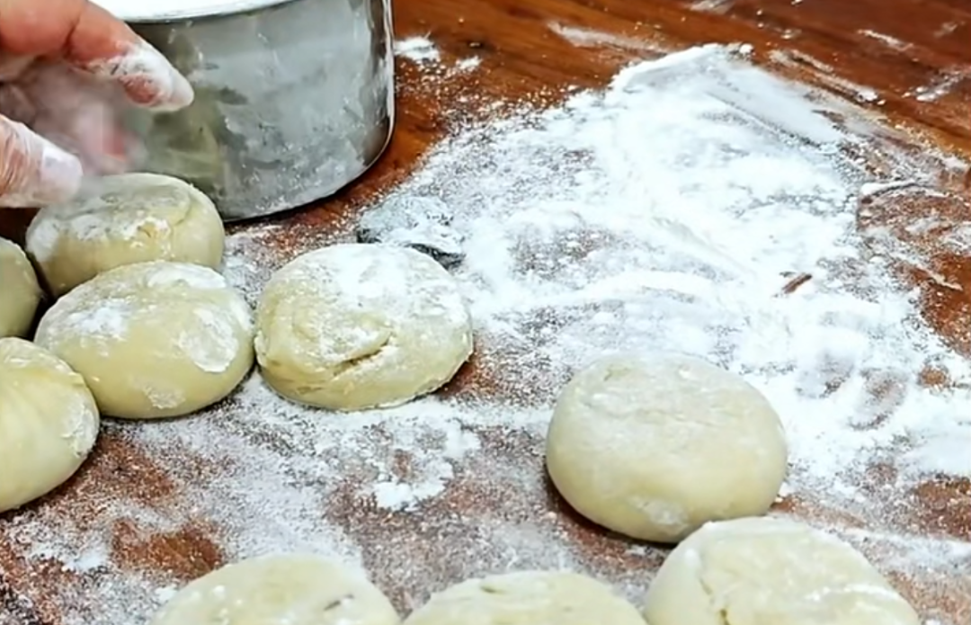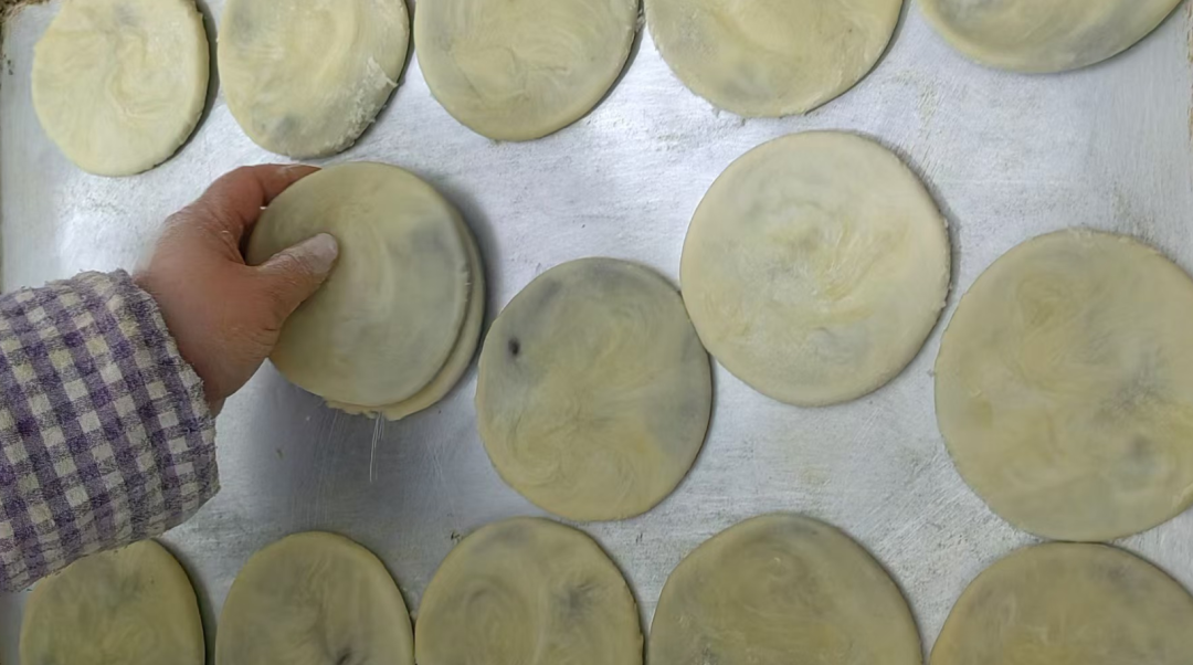 随后,将擀好的酥皮卷起,分成一个个大小均匀的剂子,包入一旁提前备好的红糖馅料,再轻擀成饼。陈师傅包馅、按压动作行云流水、一气呵成,一个个圆润的饼坯快速成型,被放入烤箱烘烤。