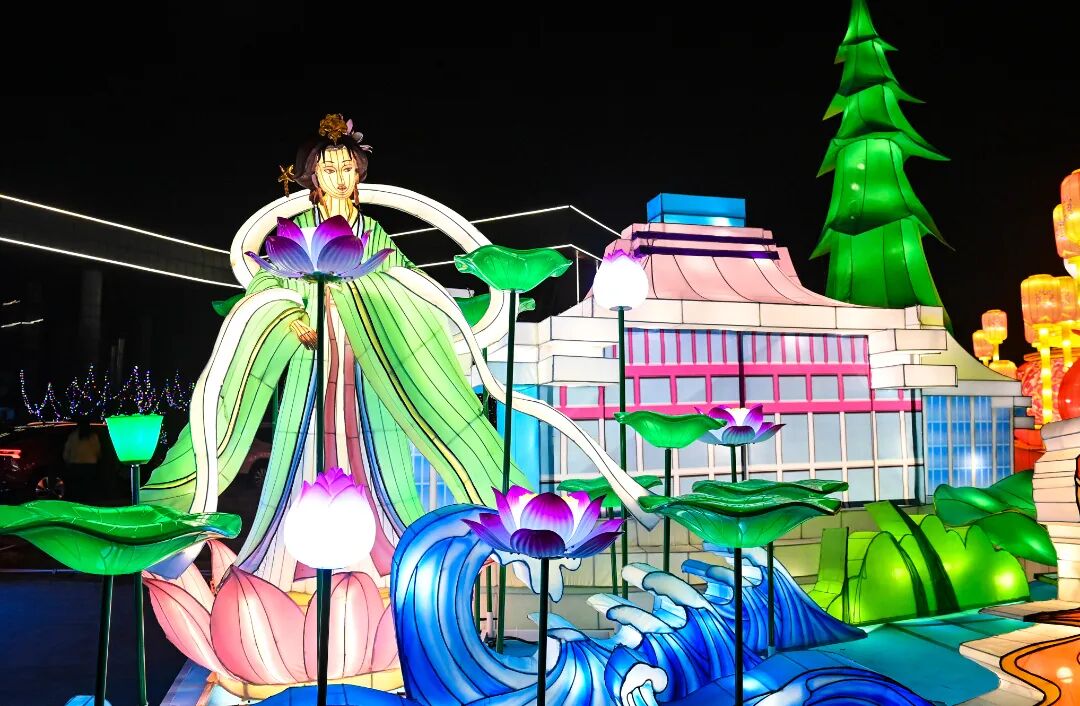 一个个造型精巧的巨型花灯如璀璨的明珠,镶嵌在夜空之中,它们或讲述着古老的神话传说,或展现着潜江的现代风貌。特别是那盏宽达18米、高6米的巨型花灯,以潜江特色为灵感设计的主题花灯,独特的造型和绚丽的色彩,成为了整场灯展的标志性景观,吸引着前来逛展的游客纷纷打卡留念。