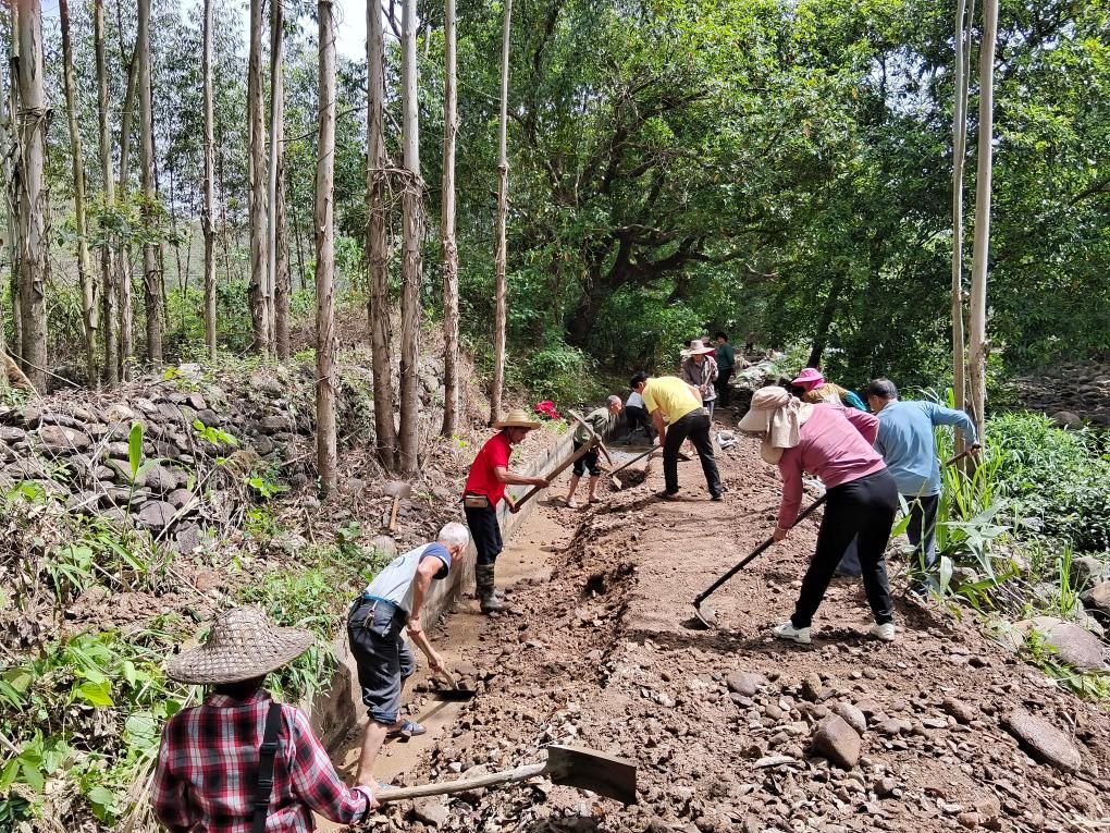 广西武宣县东乡镇屯应村党员干部与群众一起修水渠抗旱。(雷正晓 摄)