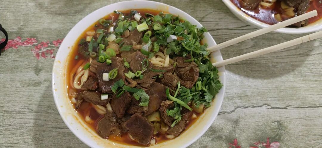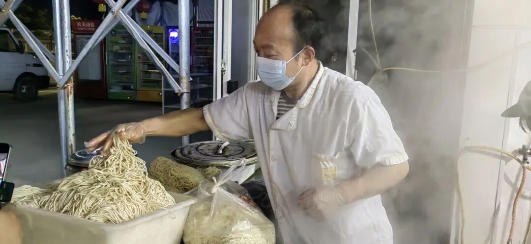 “老板,来碗牛肉面!”3点半,小店迎来首批客人,夫妻二人分工协作,谭志敏抄起长筷抖开面条,沸水翻涌中面条裹着热气滑入碗底,刘哲访则接过面碗舀上一勺牛肉,浇上红油,最后撒上葱花和香菜,1分钟左右便能完成一碗牛肉面。