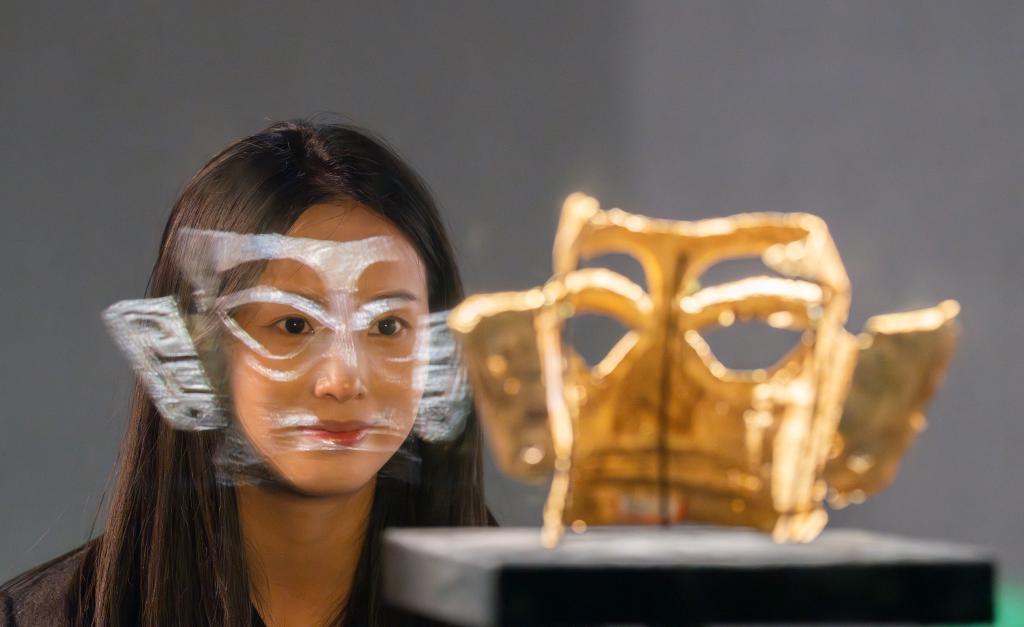 参观者在三星堆博物馆新馆展厅内观看展出的黄金面具(2024年12月18日摄)。新华社记者才扬摄