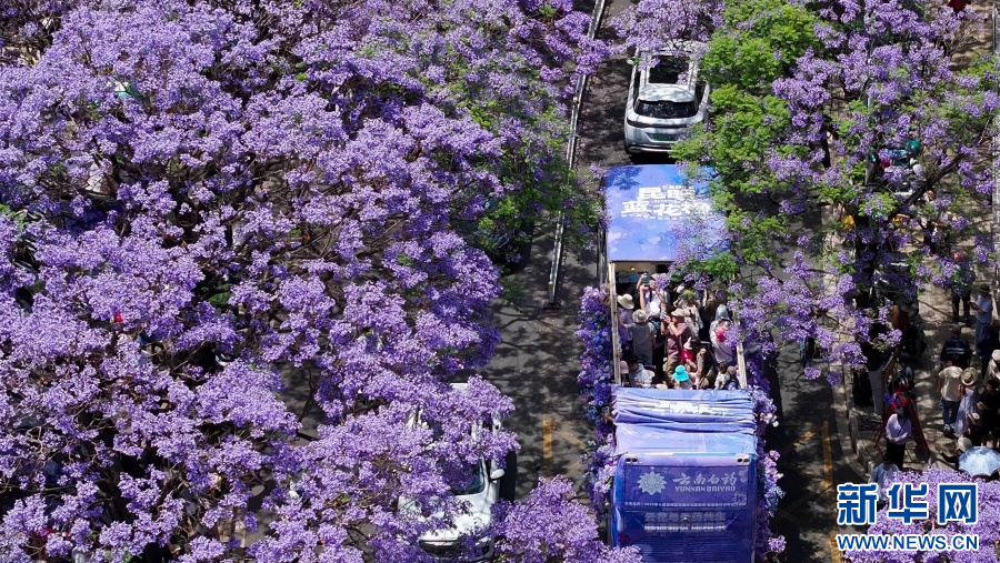 航拍蓝花楹美景,蓝花楹巴士穿梭其间(5月5日摄)。新华网 李浩 摄