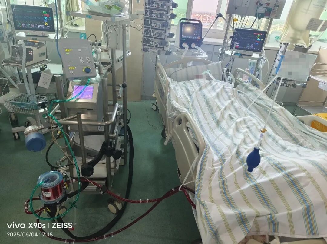 重症医学科ECMO团队接到指令后火速响应。团队在急诊抢救室内争分夺秒地为患者建立VA-ECMO体外生命支持系统。仅用数十分钟,暗红的血液经这台“救命神器”氧合后变为鲜红,重新灌注患者全身,替代了衰竭的心肺功能,维持了患者的基本生命体征。