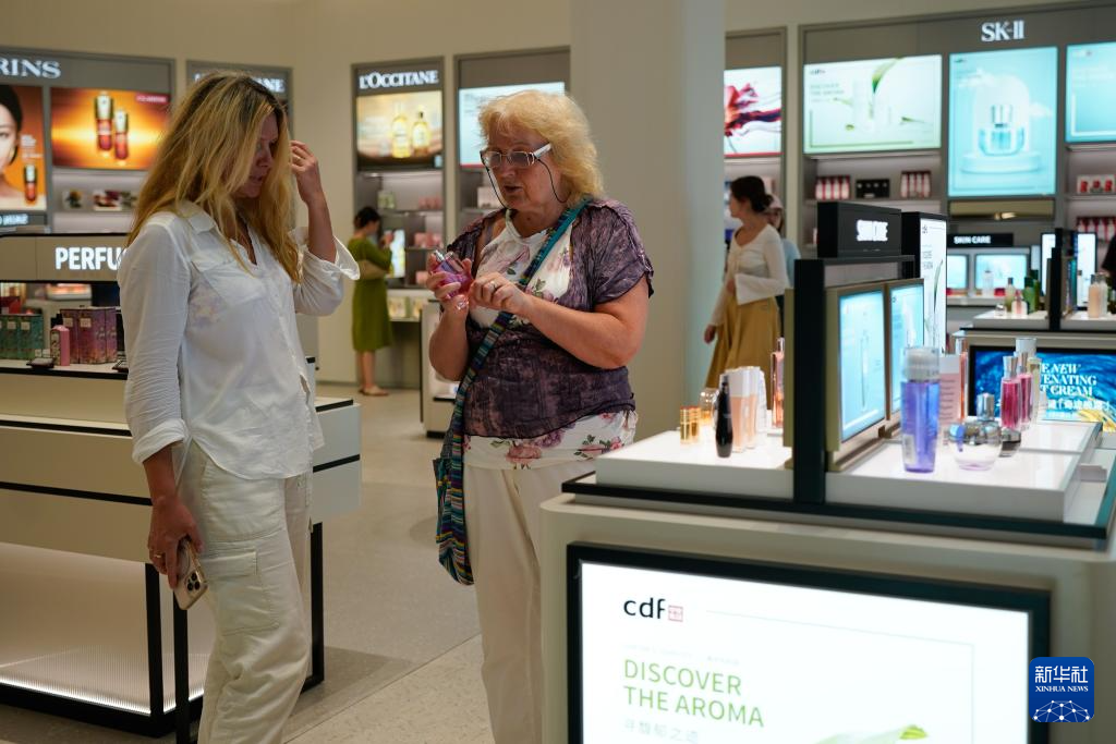 9月25日,外籍游客在成都市内免税店免税商品区域选购香水。