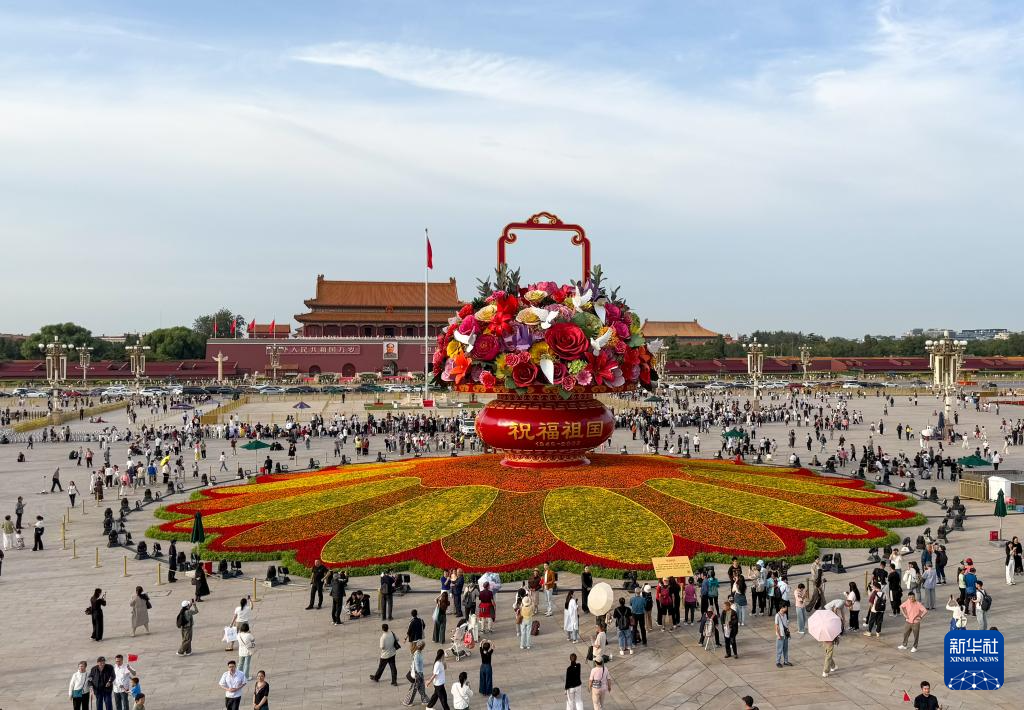 9月25日,2025年“祝福祖国”巨型花篮正式完工,亮相天安门广场与市民共度佳节。今年“祝福祖国”花坛以喜庆的花篮为主景,花坛顶高18米,篮体高16米,篮盘直径12米。篮体南侧书写“祝福祖国”“1949-2025”字样,篮体北侧书写“欢度国庆”“1949-2025”字样。篮内选取了美好寓意的花卉,其中荷花寓意“和和美美”、橄榄枝寓意“荣耀和平”等,还结合和平鸽元素,体现“和平发展、欣欣向荣”。