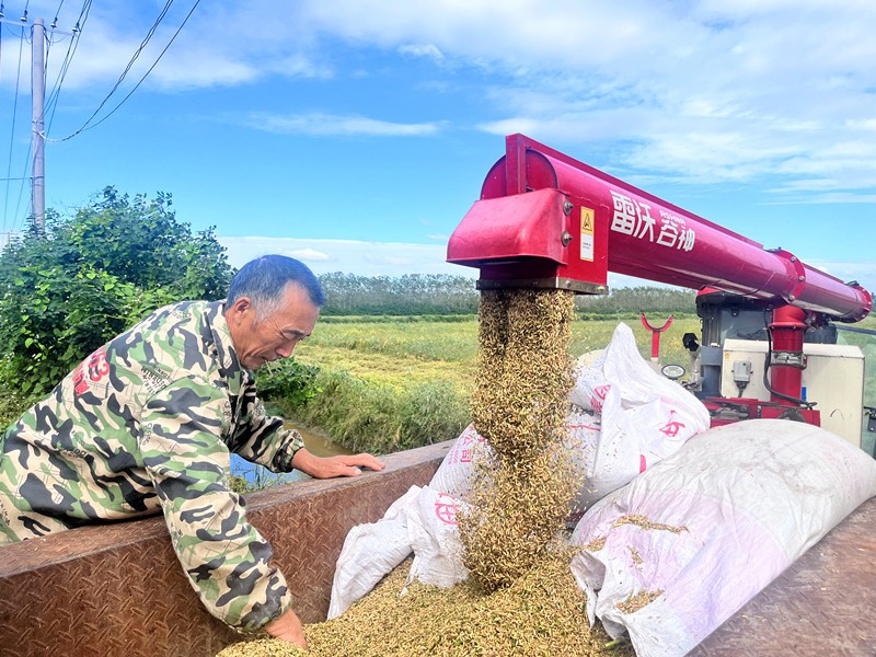 田埂上,新台村村民邓邦华紧盯着收割机的卸谷口,看着金黄的稻谷如流水般涌入粮袋,脸上满是喜悦。“我家种了20多亩水稻,以前全靠人工,两个人得忙一周,累得腰都直不起来。现在机器跑一圈,不到一小时就完成了,又省心又省力!”他指着满袋稻谷说。