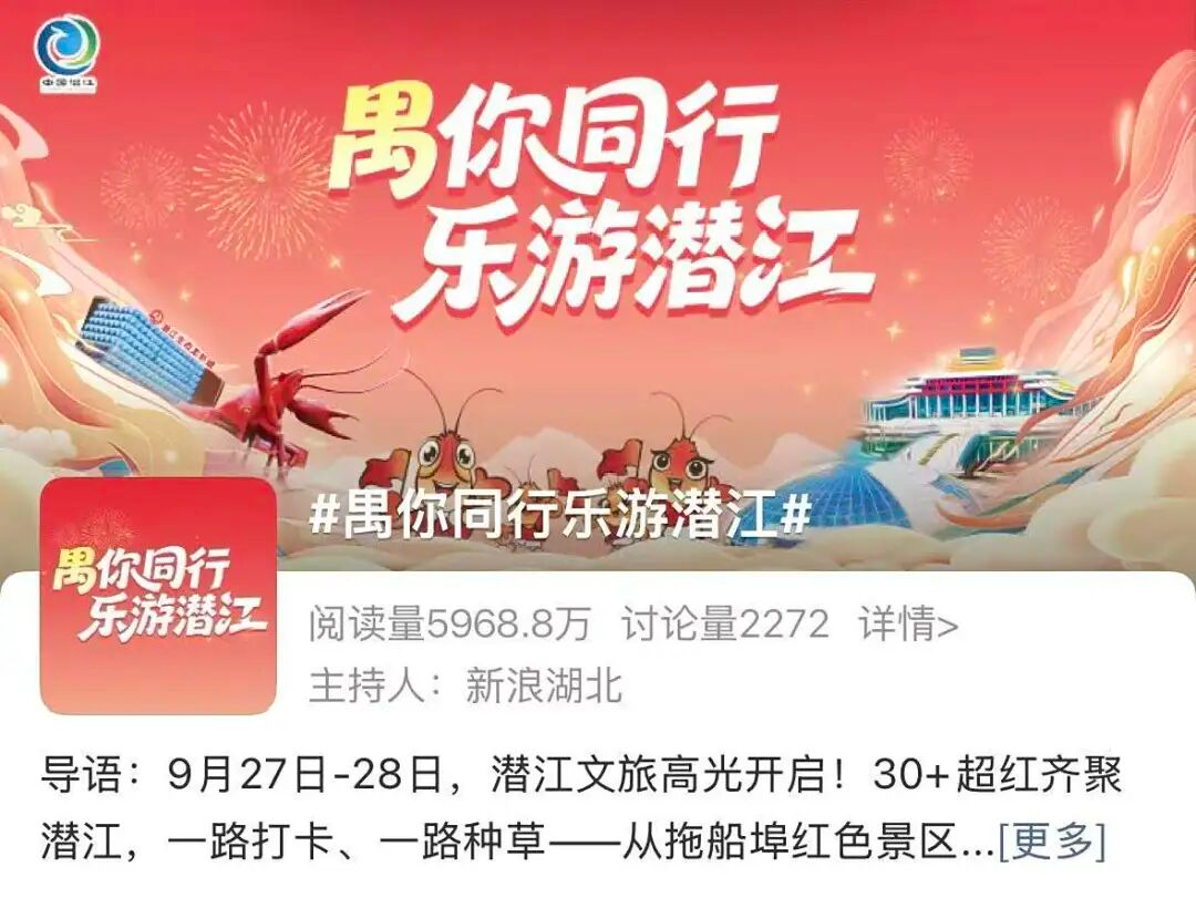 截至当日下午,#禺你同行 乐游潜江#话题阅读量突破5000万,成功荣登微博全国热搜,让潜江的多元魅力被更多人熟知与向往,也为潜江文旅发展注入了新活力。(潜江市融媒体中心记者 罗珊珊 实习生 范迦勒)