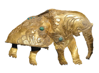 血渭一号墓出土的镶绿松石金象饰片(中国社科院考古所供图)