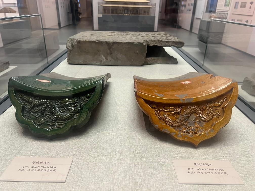 展览的中心位置,集中呈现了16件中国营造学社在古建调查中珍藏的样本,这也是这批样本首次走出清华大学、来到武汉展出。透过展柜可以看到,汉千秋万代印文砖纹路清晰,黄釉、绿釉琉璃滴水上的浅浮雕云龙纹姿态灵动,5件中国营造学社题写残片字迹可辨,无一不诉说着中国营造学社调查古建的足迹。