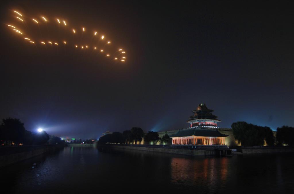2008年8月8日晚,北京奥运会开幕式燃放焰火《历史足迹》,29个巨大的焰火脚印,沿着北京的中轴线走向奥运会主会场。这是在故宫角楼上空拍摄的“脚印”。新华社记者 金良快 摄