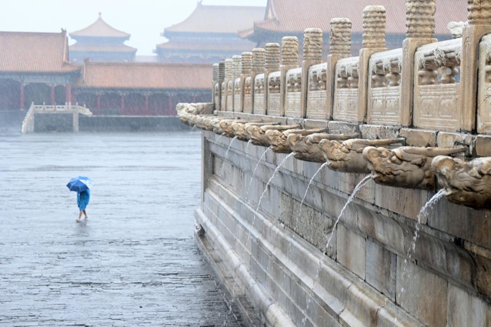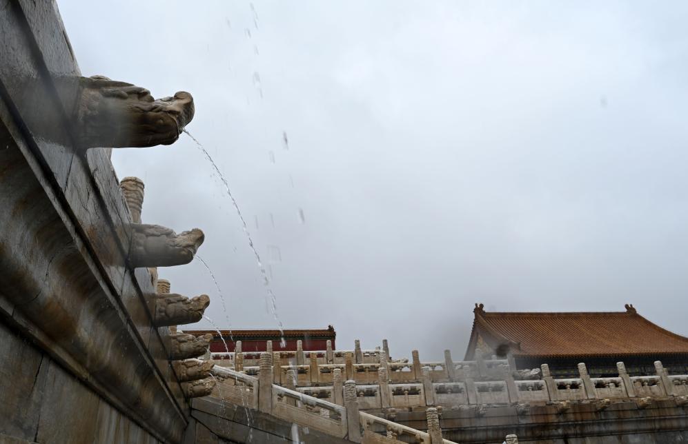 2023年7月31日,故宫太和殿台基的螭首吐出雨水。新华社记者 金良快 摄