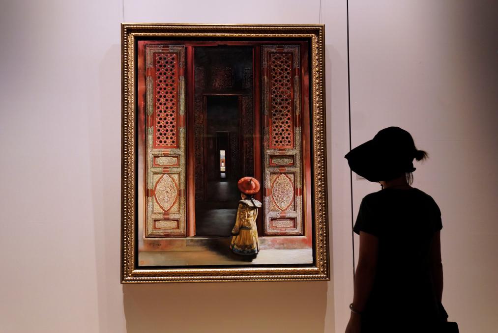 2019年9月7日,观众在故宫文华殿欣赏油画《宫门》。新华社记者 金良快 摄