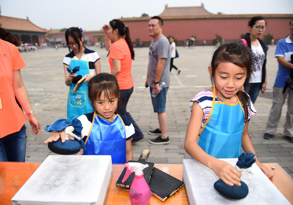 2014年8月1日,小朋友们在“故宫知识课堂”里学习石刻拓片。新华社记者 金良快 摄