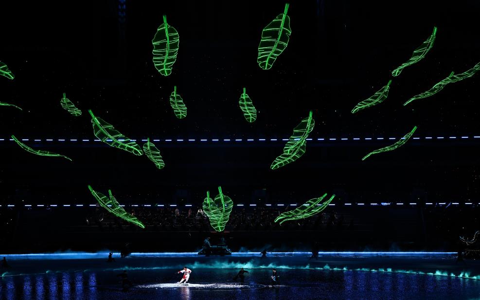 节奏忽转明快,足球、篮球、排球、骑行等体育元素跃然台上。歌曲《龙腾伶仃洋》将气氛推向高潮。奔跑的飞人与跃动的激光竞速,水上健儿在波涛中冲刺,展现科技与体育的融合。