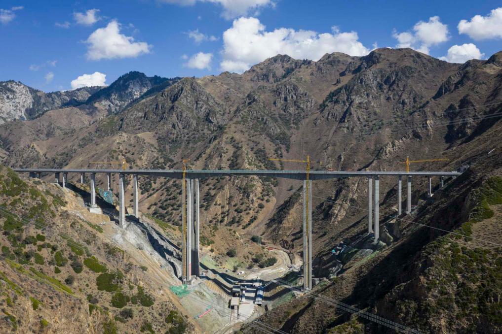 大桥承台一次浇筑混凝土量超过1500立方米。为防止温度裂缝,工程师在内部预埋冷却水管,分层控温,并采用洒水养护,使混凝土在均衡温度下缓慢凝结。28根墩柱拔节生长,从地面到桥面最高处达173米,相当于62层楼高。2023年秋,两座主墩相继封顶,标志着这座“空中通道”正式挺立在伊犁河谷之上。