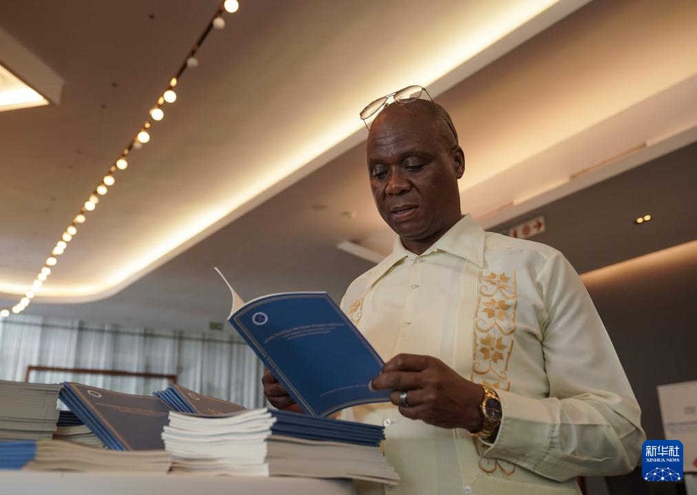 11月13日,在南非约翰内斯堡,一名与会代表在“全球南方”媒体智库高端论坛中非伙伴大会期间翻阅《共建“新型全球领导力”——迈向更加公正合理全球治理体系的共同行动》智库报告。新华社记者 韩旭 摄