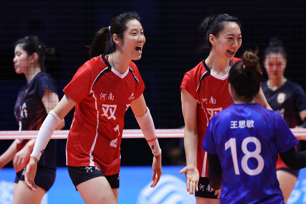 11月14日,河南队球员朱婷(左)在比赛中庆祝得分。新华社记者 陈斌 摄