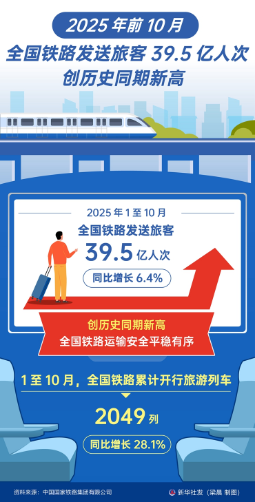 新华社北京11月16日电(记者 樊曦)记者11月16日从中国国家铁路集团有限公司获悉,今年1至10月,全国铁路发送旅客39.5亿人次,同比增长6.4%,创历史同期新高,全国铁路运输安全平稳有序。
