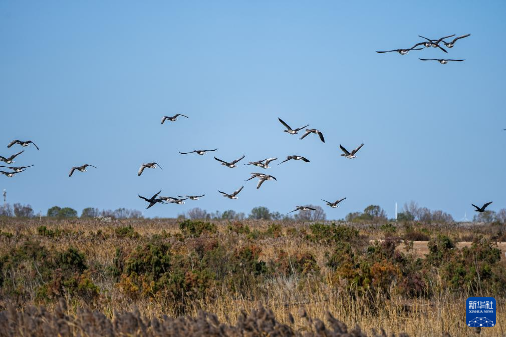 11月13日,山东黄河三角洲国家级自然保护区内,越冬候鸟在飞翔。新华社记者 朱峥 摄