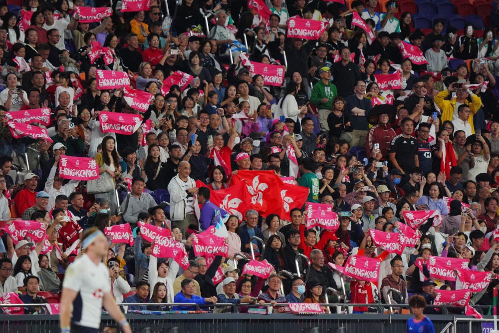 11月14日,在香港举行的第十五届全国运动会七人制橄榄球男子金牌赛中,球迷在场边加油助威。新华社记者 朱炜 摄