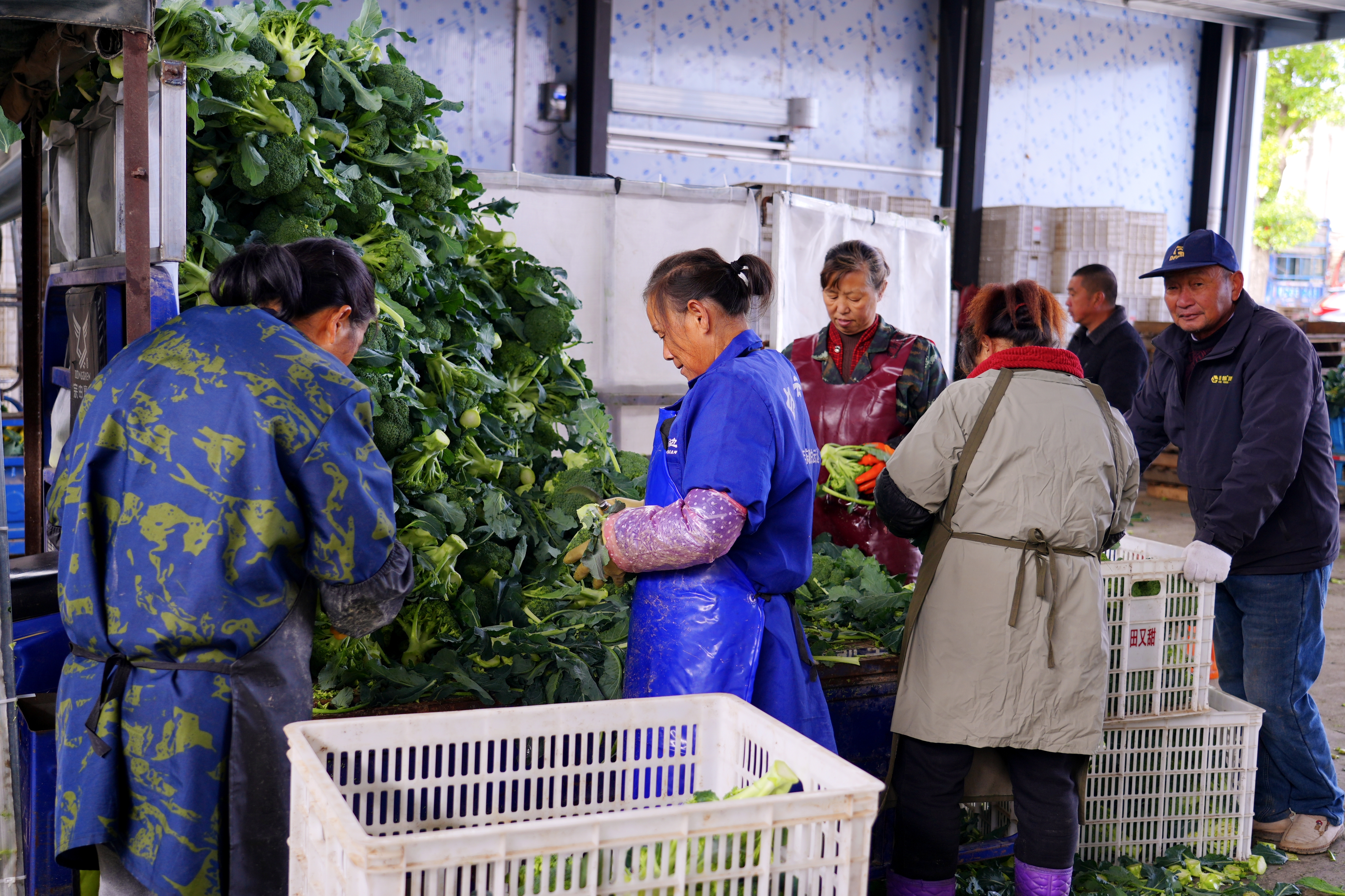 潜江市吉信家园蔬菜种植专业合作社的分拣包装现场,更是一派繁忙景象。工人们正有序将刚收购的西兰花进行分拣、称重、包装,一箱箱贴有专属标识的西兰花被搬上物流车,即将发往北京、山东、上海等地。