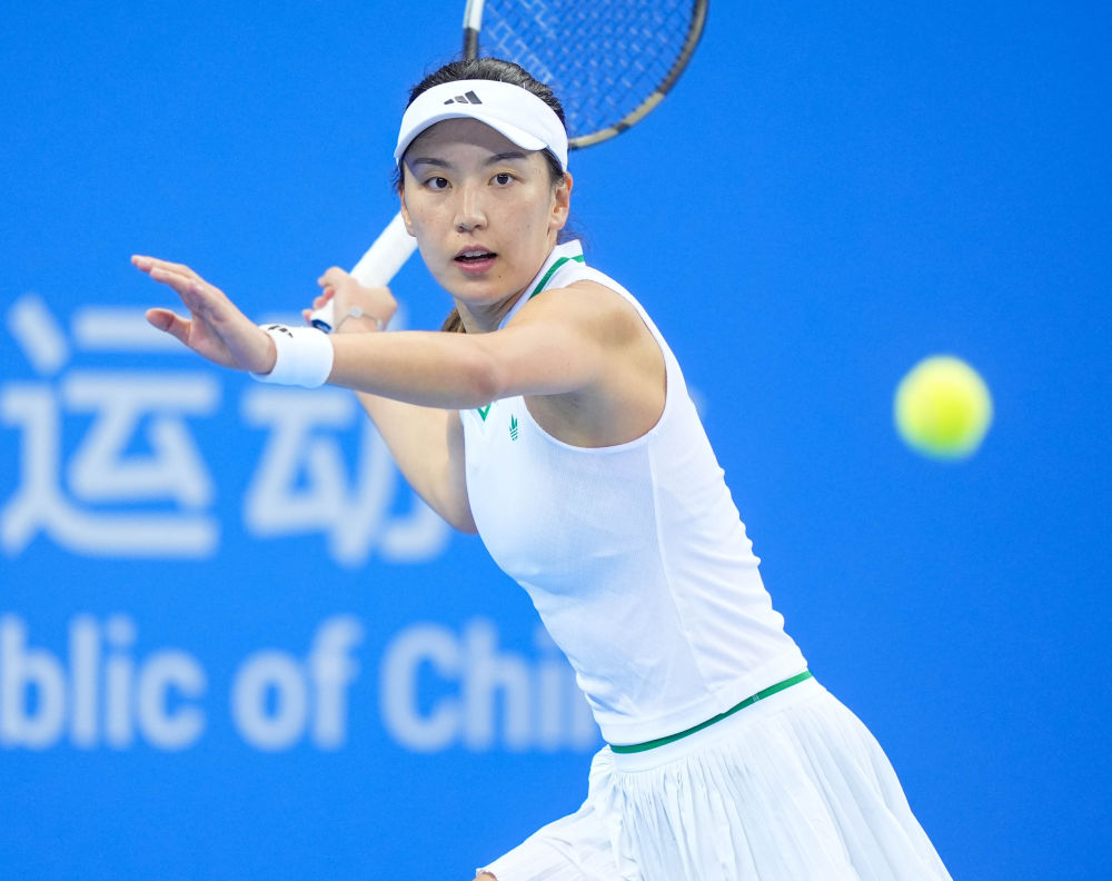11月18日,广东队选手王欣瑜在比赛中回球。当日,在广东横琴举行的第十五届全国运动会网球项目女子单打四分之一决赛中,广东队选手王欣瑜战胜天津队选手王曦雨,晋级半决赛。新华社记者 颜麟蕴 摄