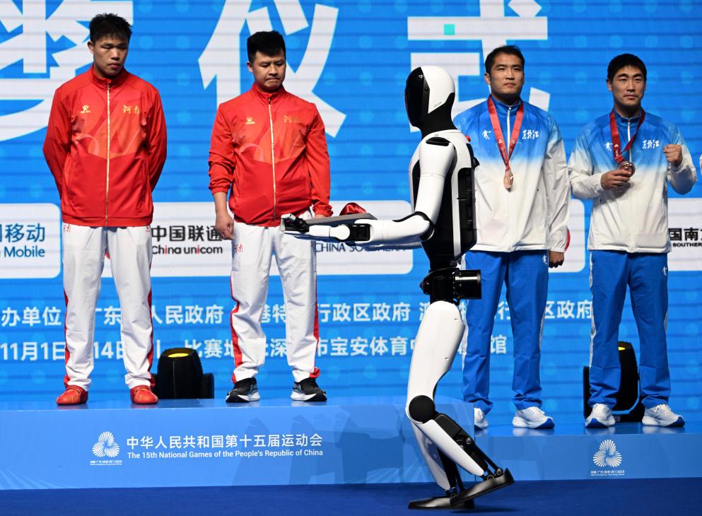 11月14日,人形机器人在拳击男子92公斤级颁奖仪式上为颁奖嘉宾递上奖牌。