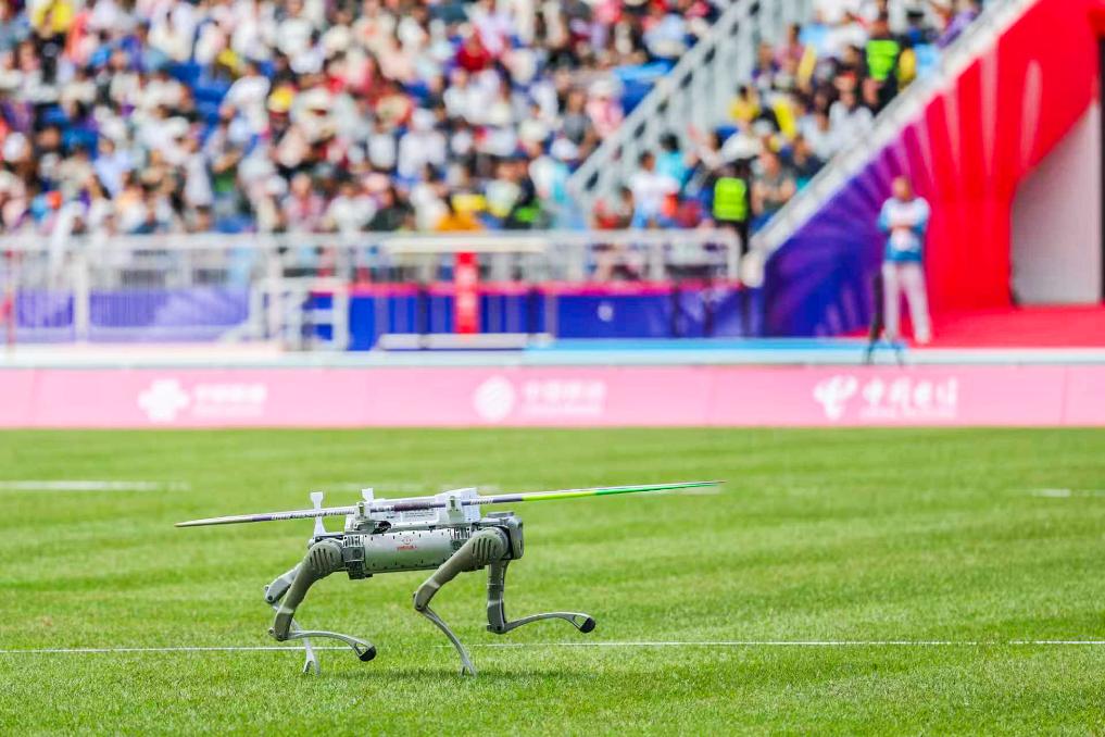 11月15日,机器狗在田径项目女子标枪及格赛中运送标枪。