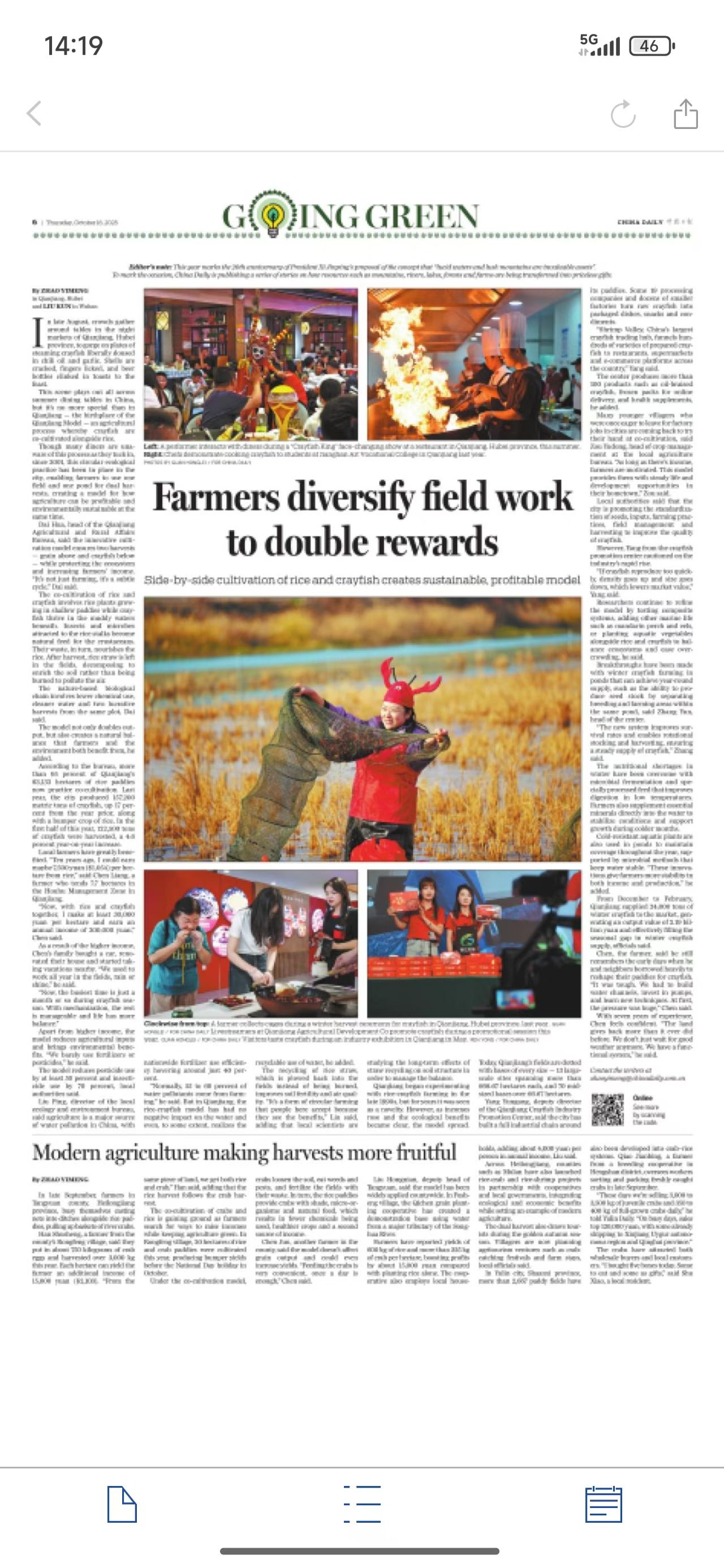 除了短视频“破圈”,《中国日报》也整版英文报道了潜江小龙虾产业,稻田养虾实景、加工车间画面,让海外读者真切感受潜江从“养虾大市”到“产业强市”的蜕变。