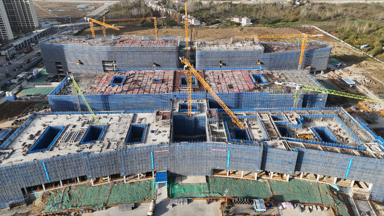 11月30日,我市新型城镇化补短板强弱项一期(市中心医院项目)项目建设现场,各楼栋正陆续封顶,预计12月底完成主体结构施工。该项目2024年12月开工,总建筑面积20万平方米,建设资金12亿元,包含门诊、医技、住院等14栋建筑,预计2027年完成全部工程建设。(潜江市融媒体中心记者 曾俊伟 刘列刚 摄)