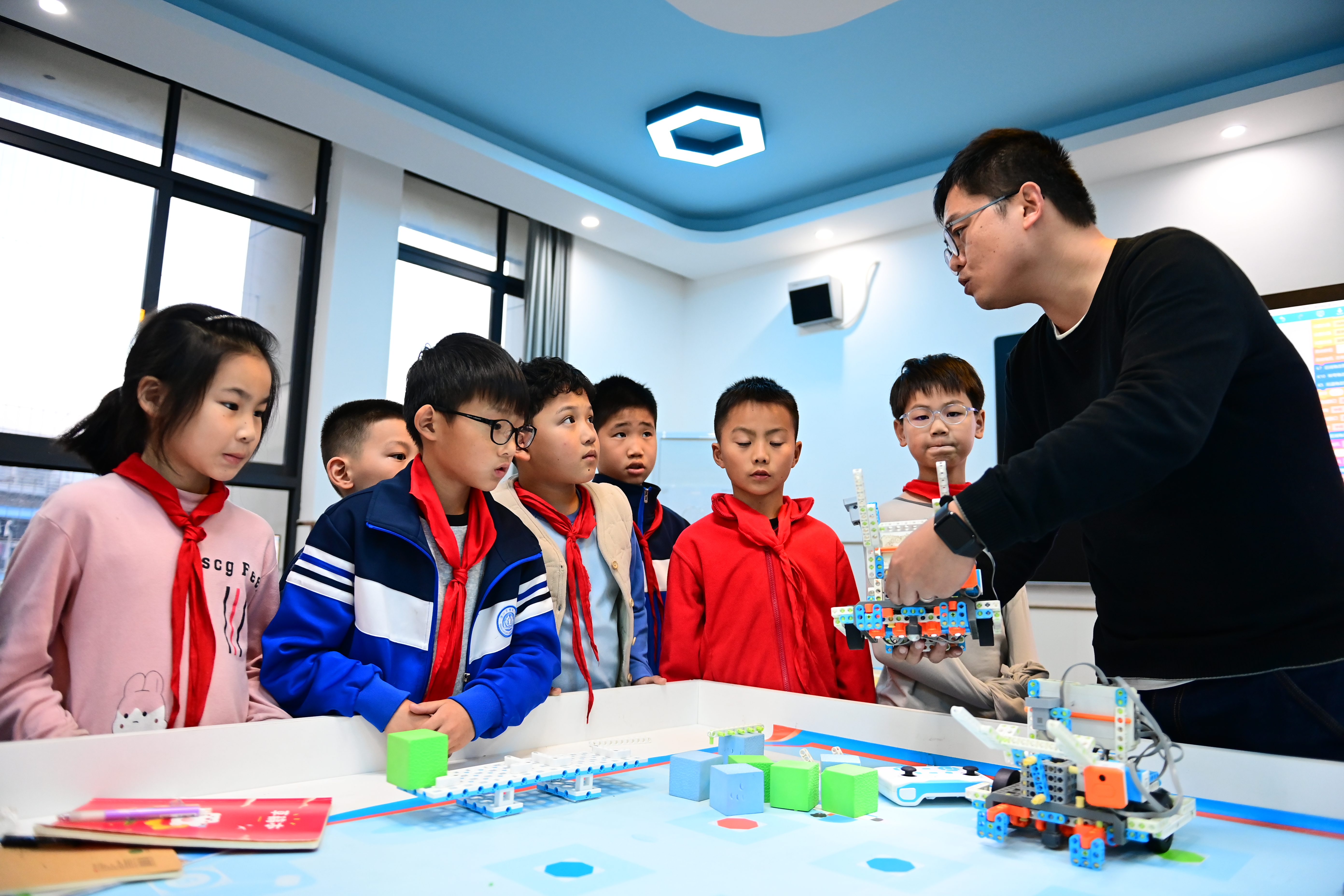 11月27日,在曹禺小学机器人课堂上,老师正手把手教学生编写程序。近年来,该校“5+2”课后服务跳出作业辅导框架,开设轮滑、书法、足球等十多项特色课程。科普课上动手实验、运动场上奋力奔跑,该校以多元课程为孩子拓宽发展空间,让课后时光成为发掘特长的黄金时段,孩子们在兴趣课堂中收获成长与坚持。(潜江市融媒体中心记者 关洪磊 摄)