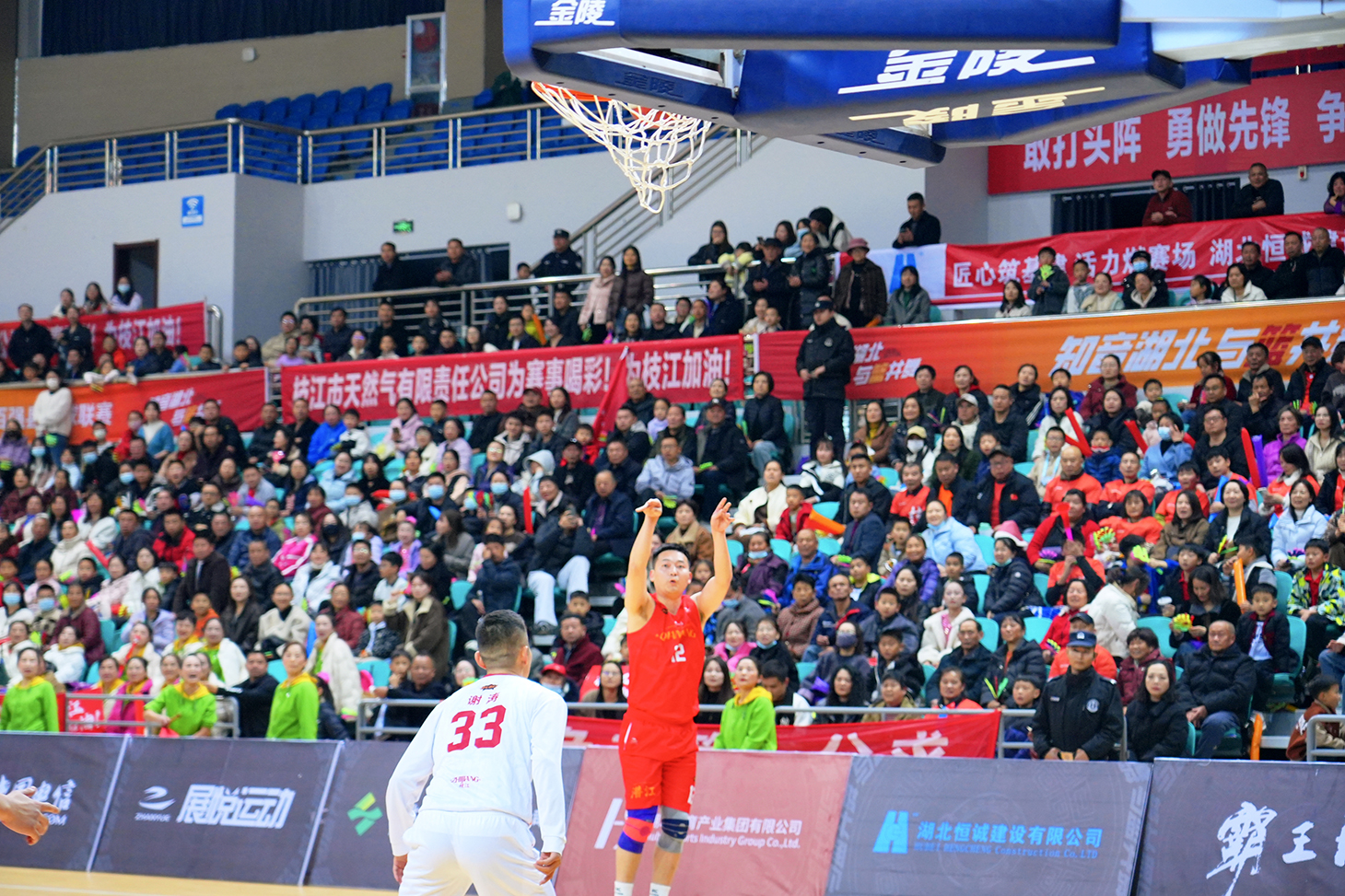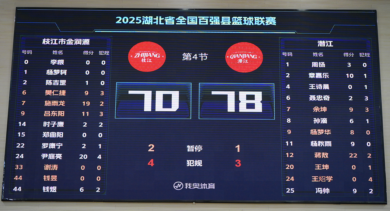 末节决战进入白热化,潜江队一度将比分拉开至74:65,枝江队暂停后疯狂追分,随后,潜江队加强防守,最终以78比70锁定胜局。