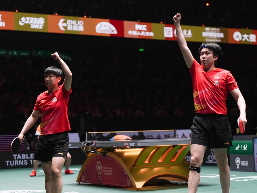 12月7日,王楚钦/孙颖莎(左)在混双比赛中庆祝得分。新华社记者 王曦 摄