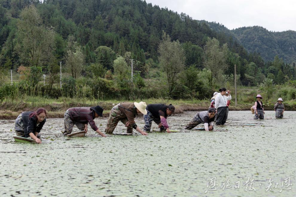 中央广播电视总台《走进乡村看小康》栏目在继昌村拍摄采摘莼菜。 (冉建秀摄)