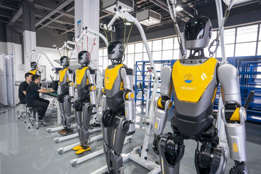 光谷筑芯科技产业园,光谷东智的机器人产线上,工程师正在检测机器人。(湖北日报全媒记者 魏铼 摄)