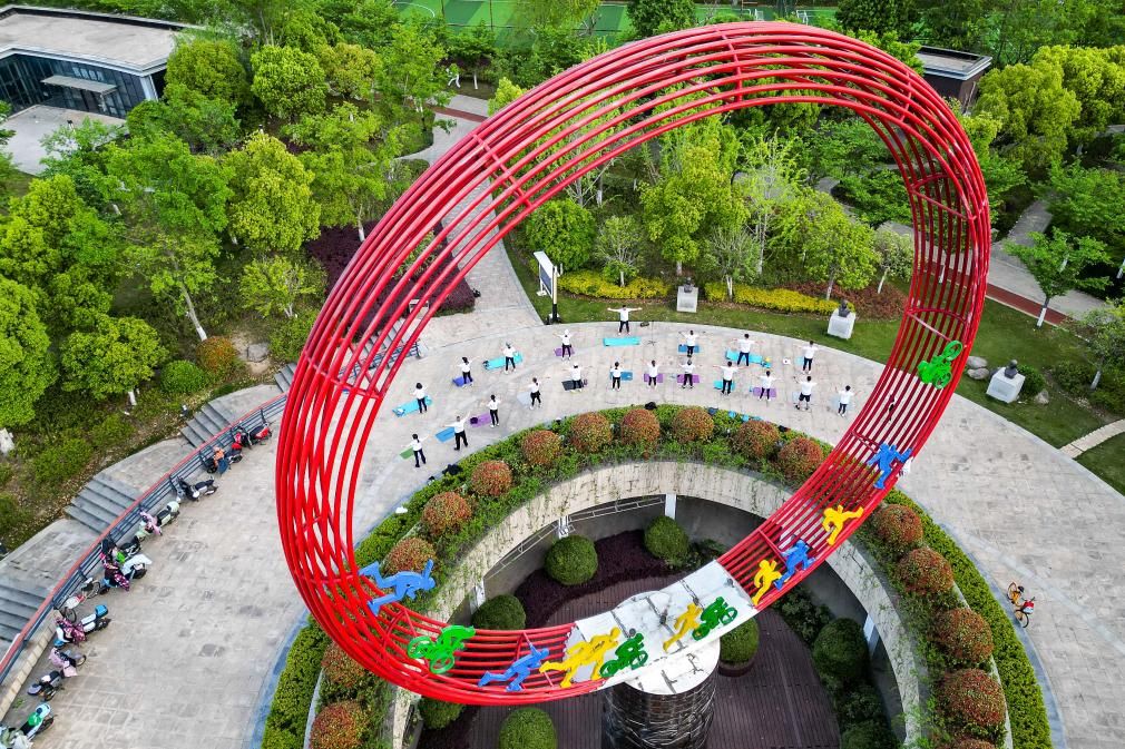 4月14日,一群坚持长期体重管理的居民在浙江省湖州市南太湖新区外庄公园“运动加油站”健身(无人机照片)。“运动加油站”站长龚循红介绍,该公益站点已帮助上百人实现体重“突围”。