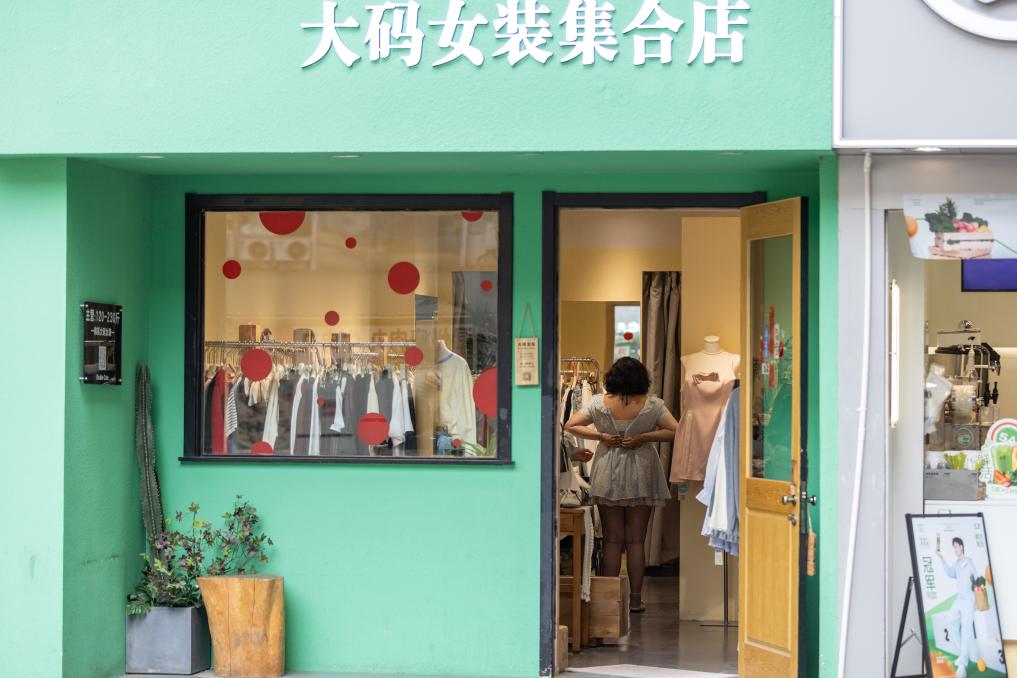 4月1日,浙江省湖州市吴兴区一家大码女装店里,一名顾客在试穿服装。