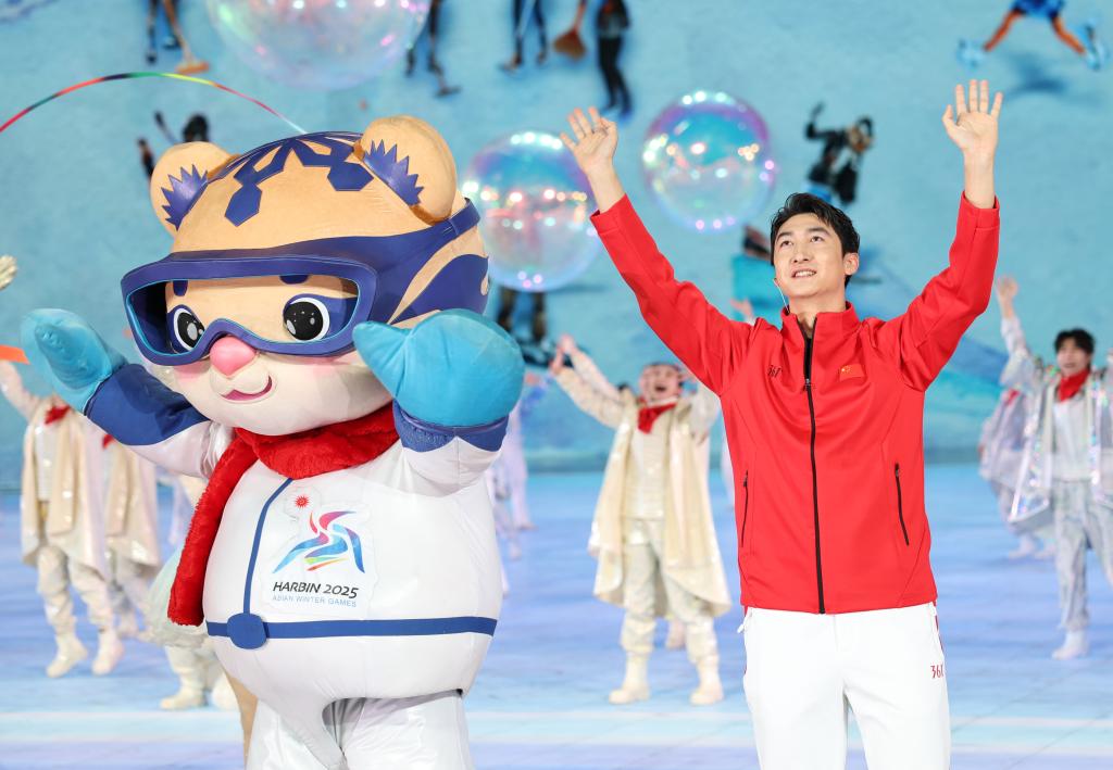这是2025年2月7日,奥运冠军武大靖(前右)在第九届亚洲冬季运动会开幕式上。新华社记者 黄伟 摄