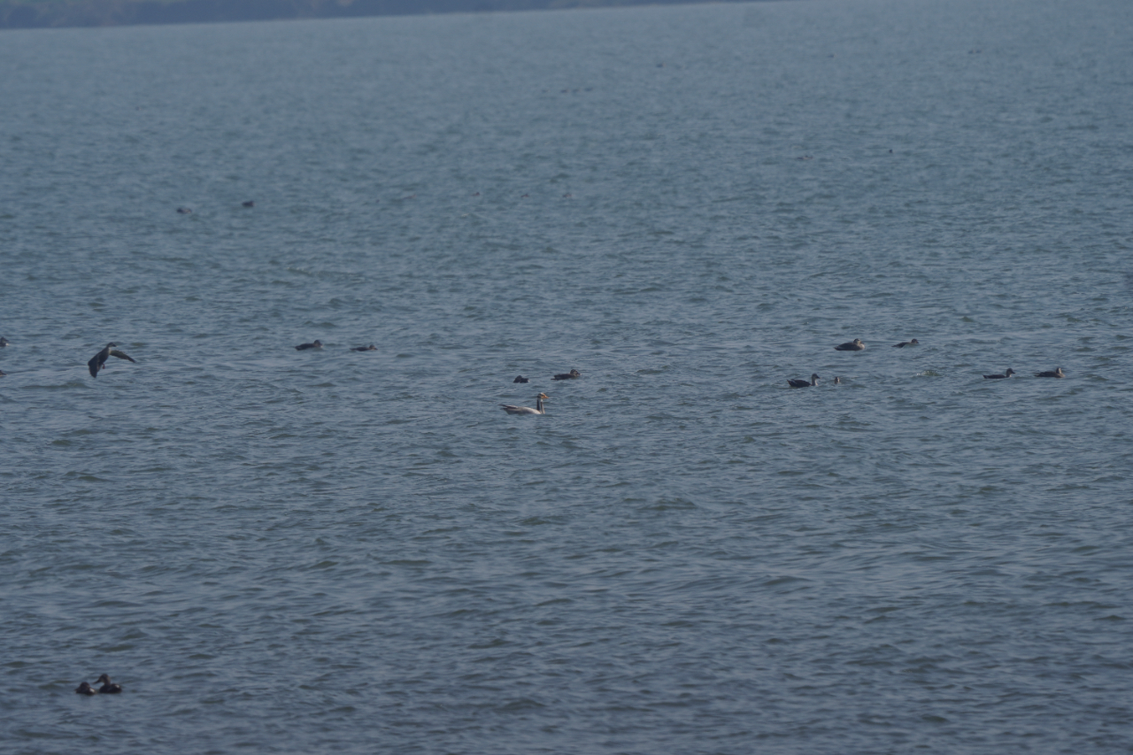 1月9日清晨,汉江兴隆大坝上游薄雾未散。全国越冬水鸟同步调查监测潜江队的高倍望远镜里,200余只豆雁组成的雁群中,一只羽色独特的水鸟格外醒目。