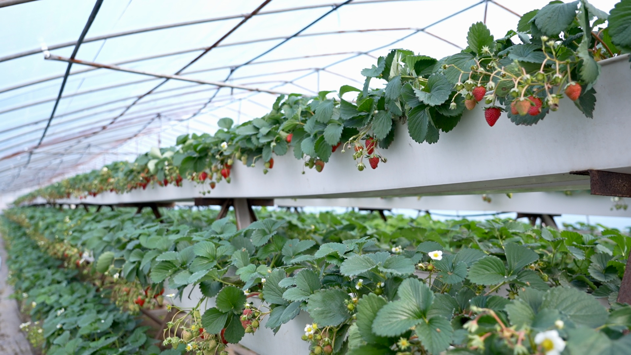番茄大棚旁的草莓温室同样热闹。掀开保鲜膜,浓郁的草莓香瞬间弥漫开来。翠绿的叶片间,一颗颗成熟的草莓红得发亮,果肉饱满紧实,表面的籽清晰可见,颜值与质感双双在线。