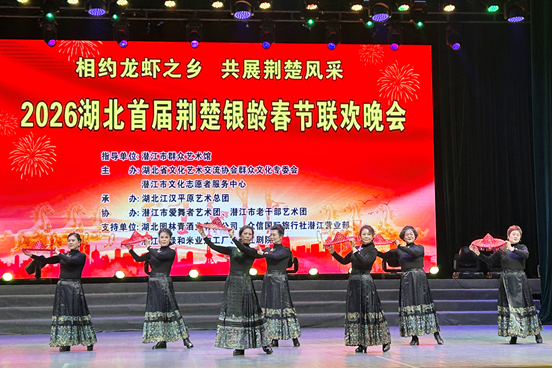 1月12日下午,潜江剧院灯火璀璨、音乐飞扬,“相约龙虾之乡 共展荆楚风采”2026湖北首届荆楚银龄春节联欢晚会在此上演。来自武汉、天门、仙桃、洪湖、潜江的27支老年文艺团队齐聚“中国小龙虾之乡”,用多元艺术盛宴展现新时代老年人的别样风采。