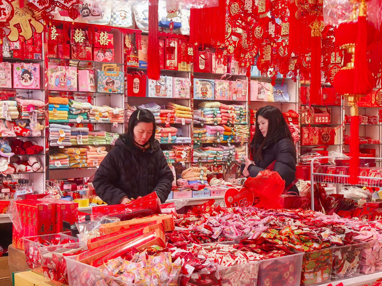 春节将至,我市各大年俗用品市场迎来销售热潮。1月22日,在堤街一商铺,红彤彤的灯笼、春联等年俗用品琳琅满目,吸引众多市民前来挑选采购,红火的选购场景,勾勒出一幅温馨的迎新春图景。(潜江市融媒体中心记者 罗珊珊 实习生 谢晓涵)
