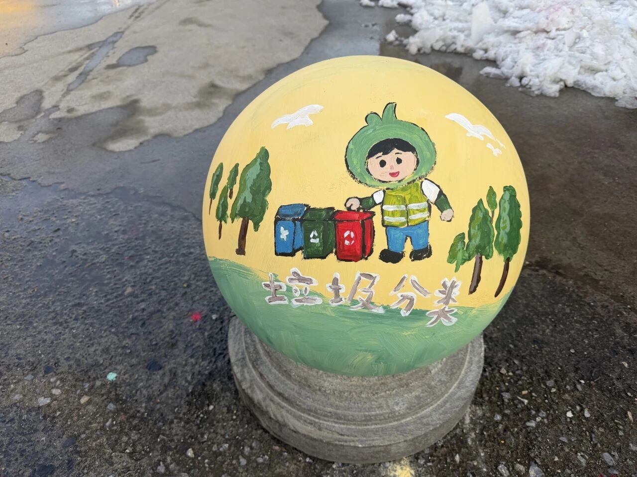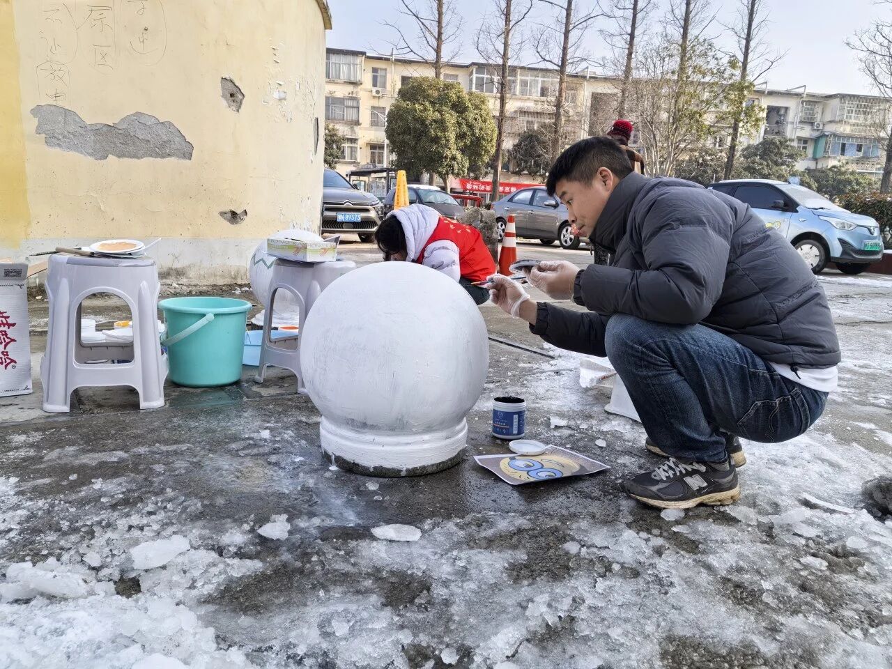 在江钻社区,以“文明新风·绿色生活”为主题的服务大厅两侧石墩彩绘美化工作启动。色彩明快的图案涵盖文明养犬、垃圾分类等内容,让原本单调的石墩成为传播文明的“活教材”。尽管冬日严寒,社区志愿者们仍热情投入彩绘,不少居民主动帮忙递工具、提建议,现场氛围温暖融洽。