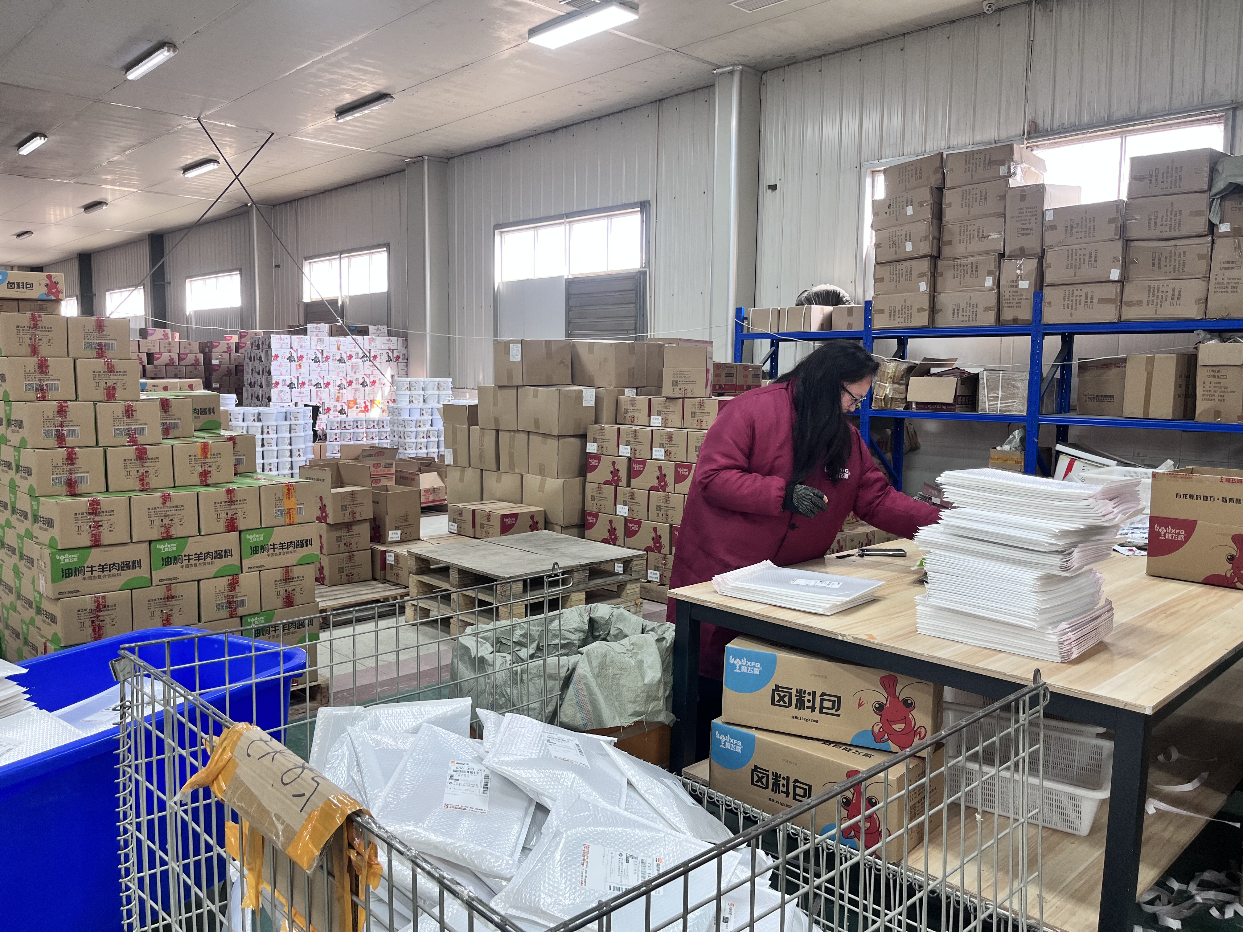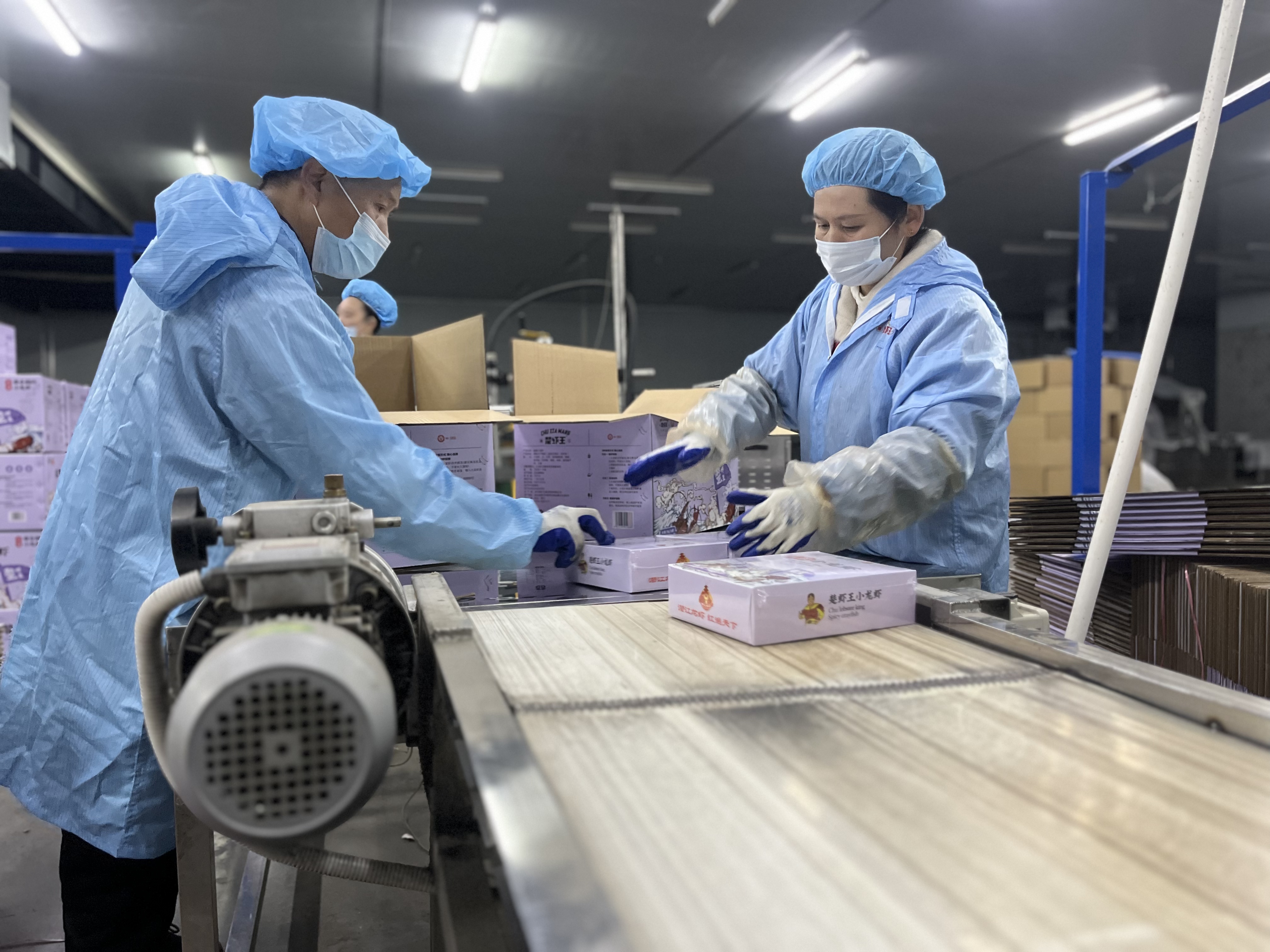 不远处的湖北楚虾王食品科技有限公司仓库内,自动化生产线有序运转,工人们忙着验盖、装箱、封条、搬运,全力保障订单供应。