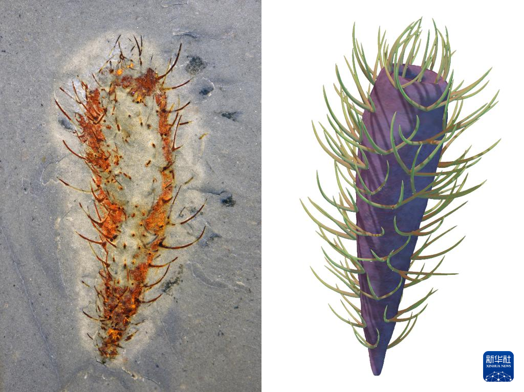 花垣生物群叶足动物-柯林斯虫化石图(左)和复原图。新华社发