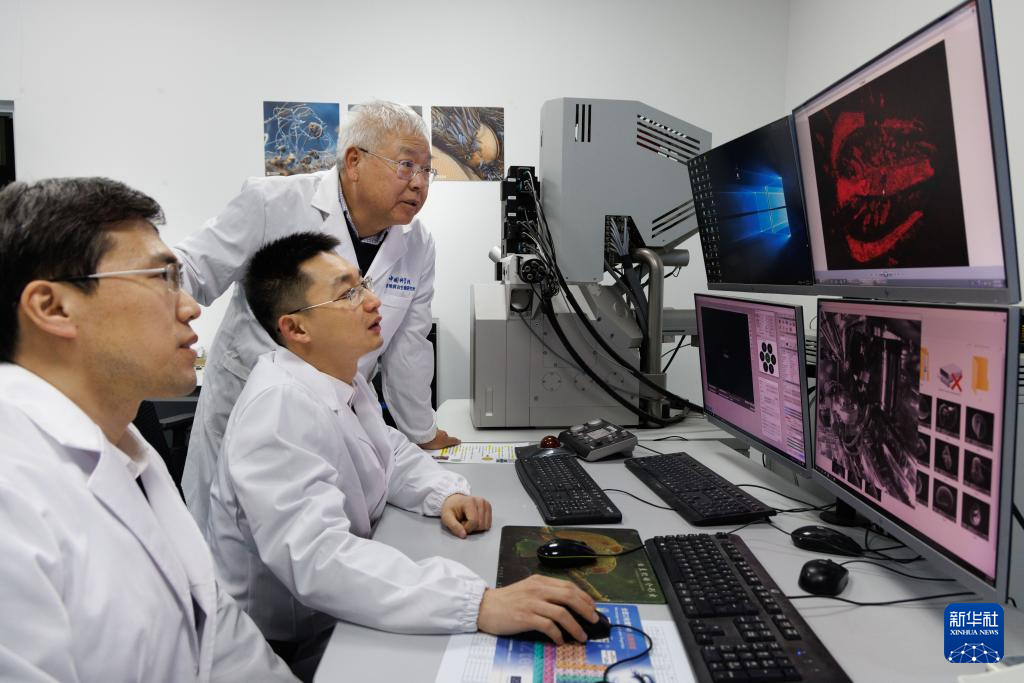 1月22日,在中国科学院南京地质古生物研究所拉曼-场发射联用扫描电镜实验室,中国科学院院士、研究员朱茂炎(后),研究员赵方臣(前),副研究员曾晗(中)在观察扫描电镜扫描的化石图。新华社记者 金立旺 摄