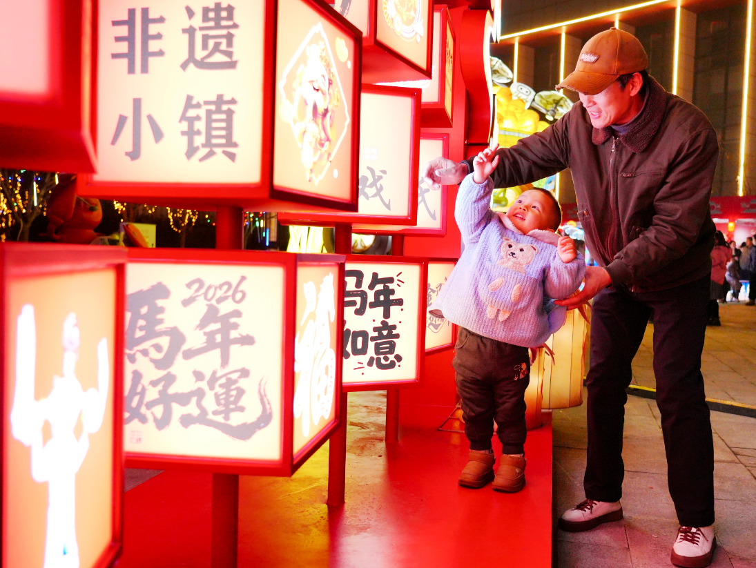 “长翅膀的马也太灵动了!”市民王女士举着手机,在“马”元素主题花灯前为孩子定格笑脸。灯组羽翼轻展、光影流转,俏皮的造型引得游客纷纷驻足打卡,快门声与欢笑声交织成趣,马年新春的氛围感瞬间拉满。